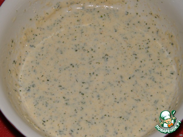 Готовим соус:сливки смешиваем со сметаной, добавляем прованские травы, чесночок, горчицу зернистую. Все хорошенько взбиваем миксером, но не в пену.