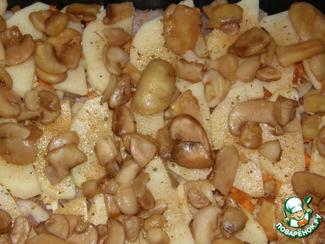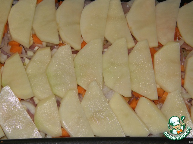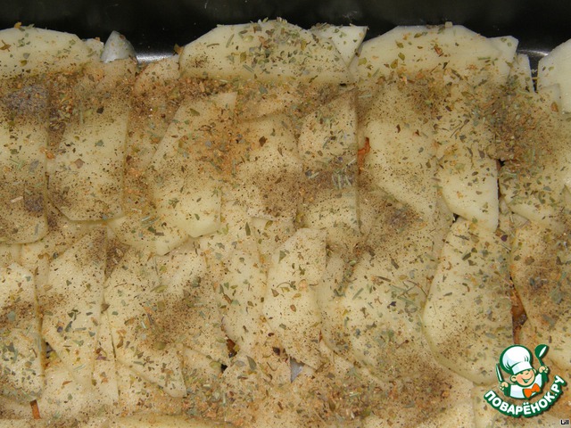 Картофель режем тонкими ломтиками, выкладываем вторым слоем на лук и обильно посыпаем специями.