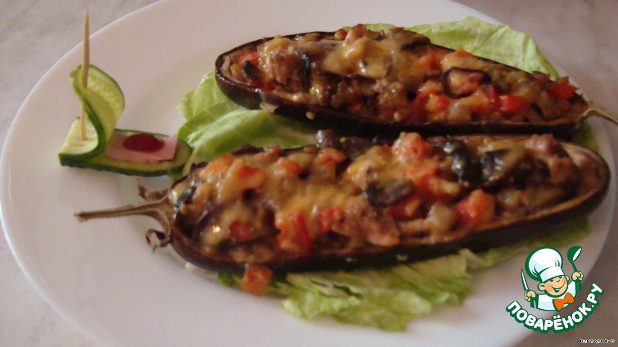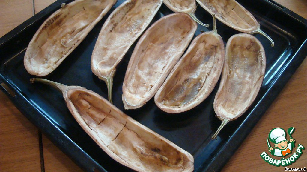 Баклажаны разрезать вдоль на 2 половинки, выбрать ложкой мякоть. Но не выбрасывать её, пригодится. Посолить половинки, оставить минут на 20. Потом промыть и обсушить. Укладываем на противень, ставим в духовку на 20 минут.