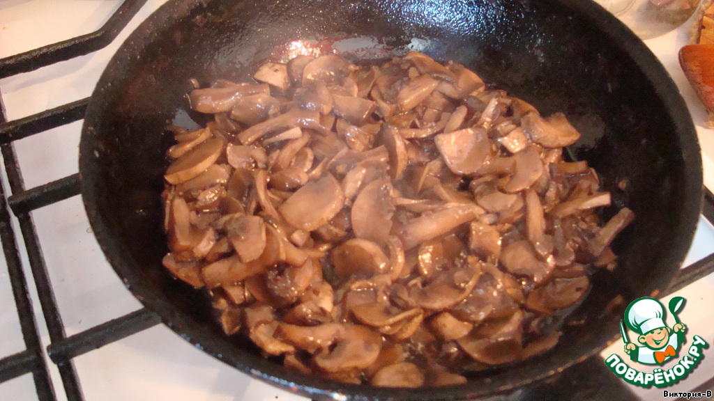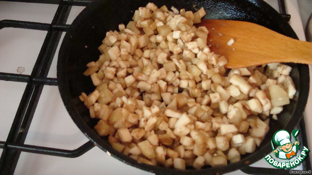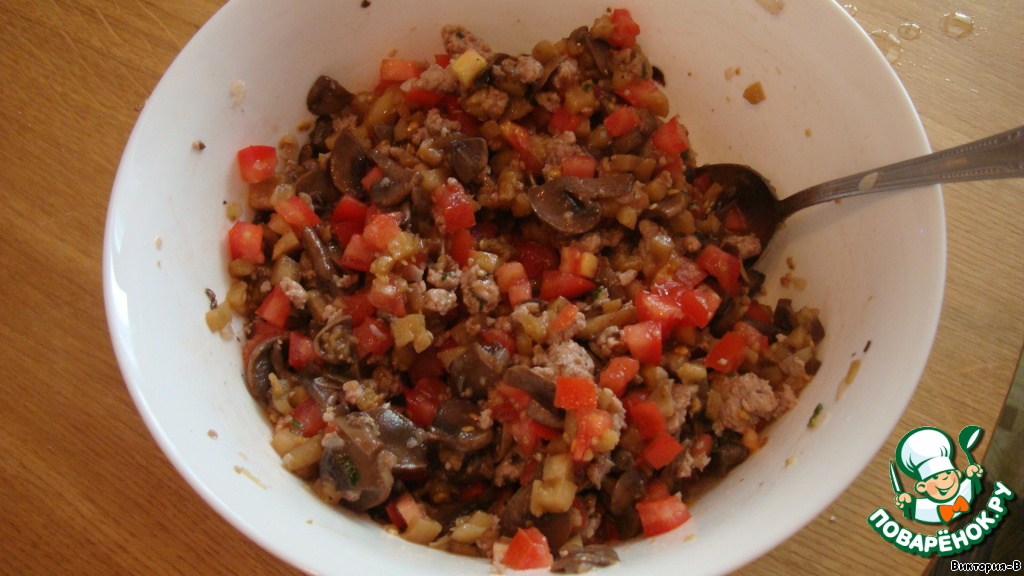 Смешиваем готовые грибы, фарш, мякоть баклажана, помидоры, чеснок, соль, перец.