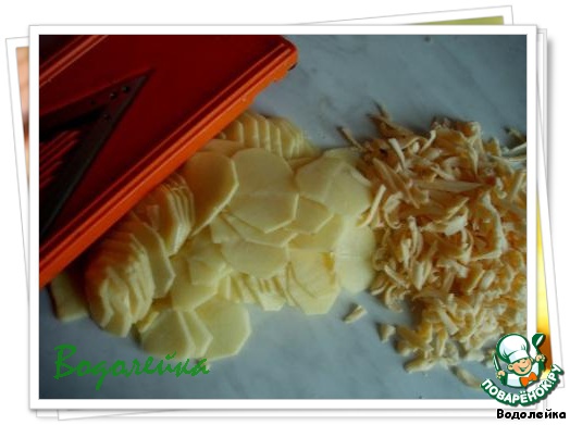 Картофель помыть, почистить и тонко порезать кружечками. Я резала при помощи терки. Сыр натереть. Количество картофеля я указала приблизительно. Все это берется, как говорят, "на глаз".