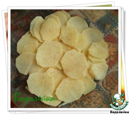 Начинаем собирать нашу запеканку. Форму для запекания смазать маслом и выложить 1\\3 нашей картошки. Картофель так же можно немного присолить, и я сверху потерла немного мускатного ореха (так я поступила с каждым слоем картофеля). Но не забываем, что у нас грибы и заливка так же с солью и приправами.