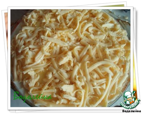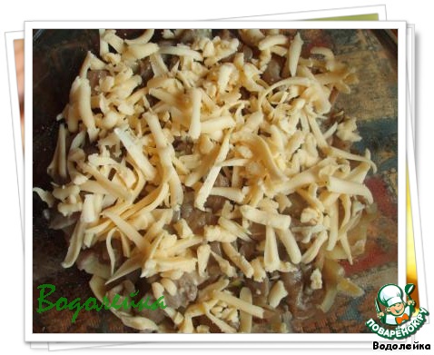 На грибы - оставшийся картофель и весь оставшийся сыр. Сыр должен хорошо покрыть верхний слой, поэтому, при надобности, дотереть еще.