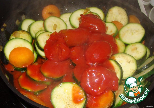 Морковь порежьте на кружочки...толщиной 2-3 мм...порежьте лук...и обжарьте морковь с луком до золотистого цвета на растительном масле...Цукини режем кружочками..добавляем в морковь...обжариваем все вместе 3 минуты