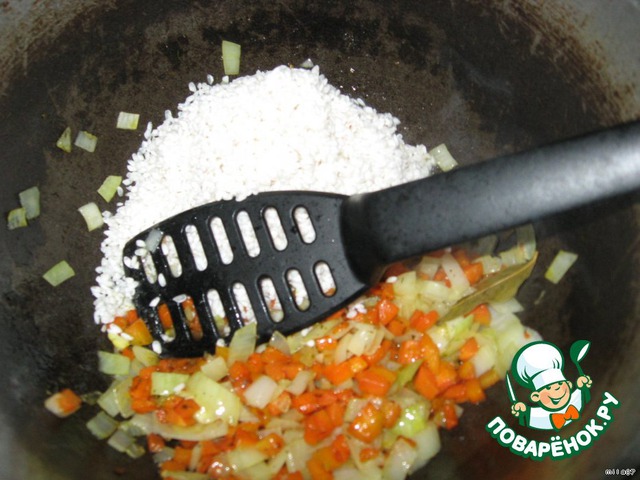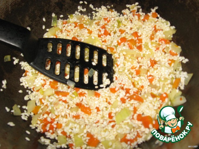 Когда лук будет готов наполовину, добавляем промытый рис.