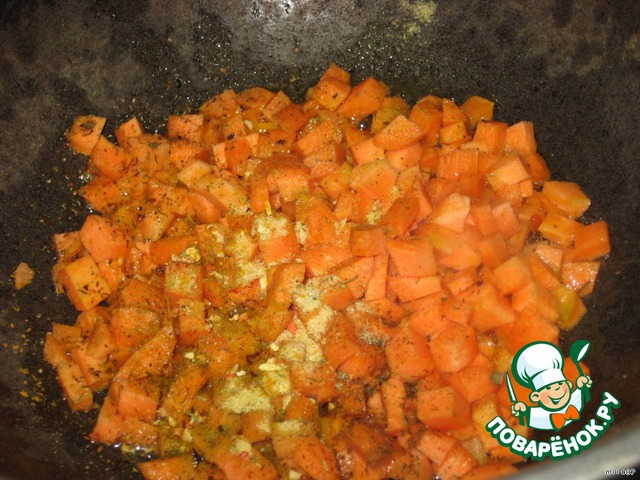 Морковь режем одинаковыми кубиками (примерно 1 см), обжариваем на масле, на сильном огне, постоянно помешивая.