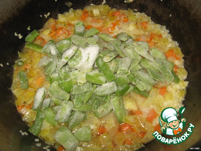 Когда вода почти впитается добавляем фасоль, но, если фасоль не домашняя, она готовится чуть дольше.