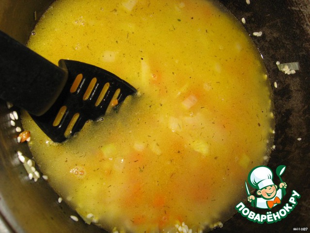 Заливаем бульоном (у меня мясной), чтобы покрывал на 3-4 см.