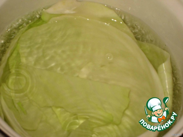 Капустные листья отварить в подсоленной воде 5-7 минут. Отсудить.