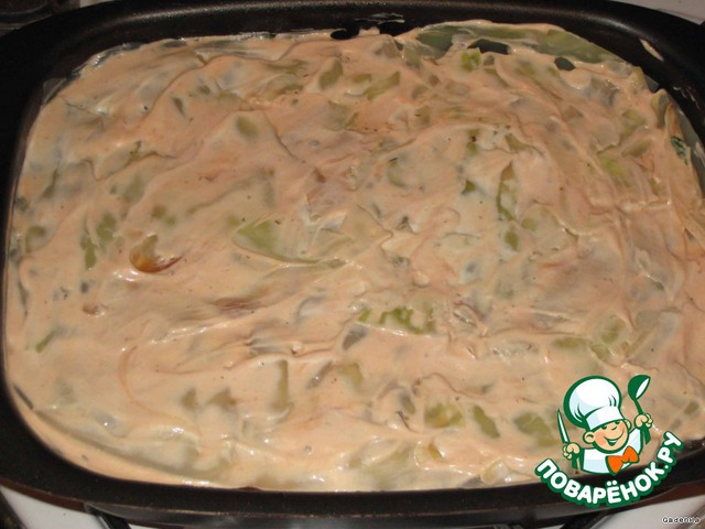 Смазать верх смесью из кетчупа, сметаны и майонеза и отправить в духовку на 30-35 минут при 180 С.
