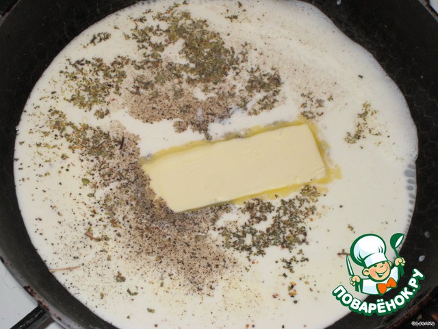 Сливки нагреть, посолить, поперчить, добавить сливочное масло, сушеные травки и добавить натертые плавленые сырки, постоянно помешивая. Сделать массу однородной и остудить до теплого.