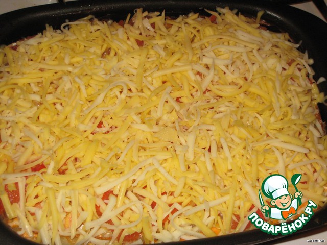 Через 30-35 минут достаем лазанью, распределяем поверх порезанные помидор и засыпаем тертым сыром. Можно еще выложить порезанные оливки или маслины. Убираем обратно в духовку до зарумянивания сыра примерно на 10-12 минут.