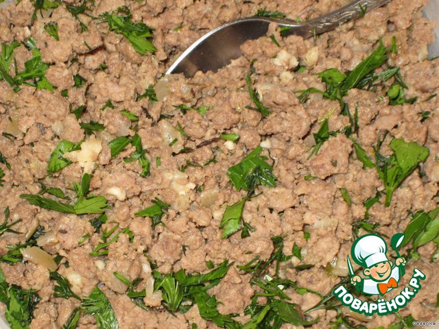 Фарш обжарить с луком, как вы это всегда делаете, не забываем посолить, поперчить, добавить паприку, базилик, орегано, тимьян и т.д. (на вкус), добавить чеснок и порубленную зелень, перемешать.