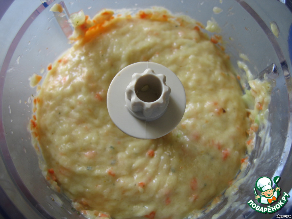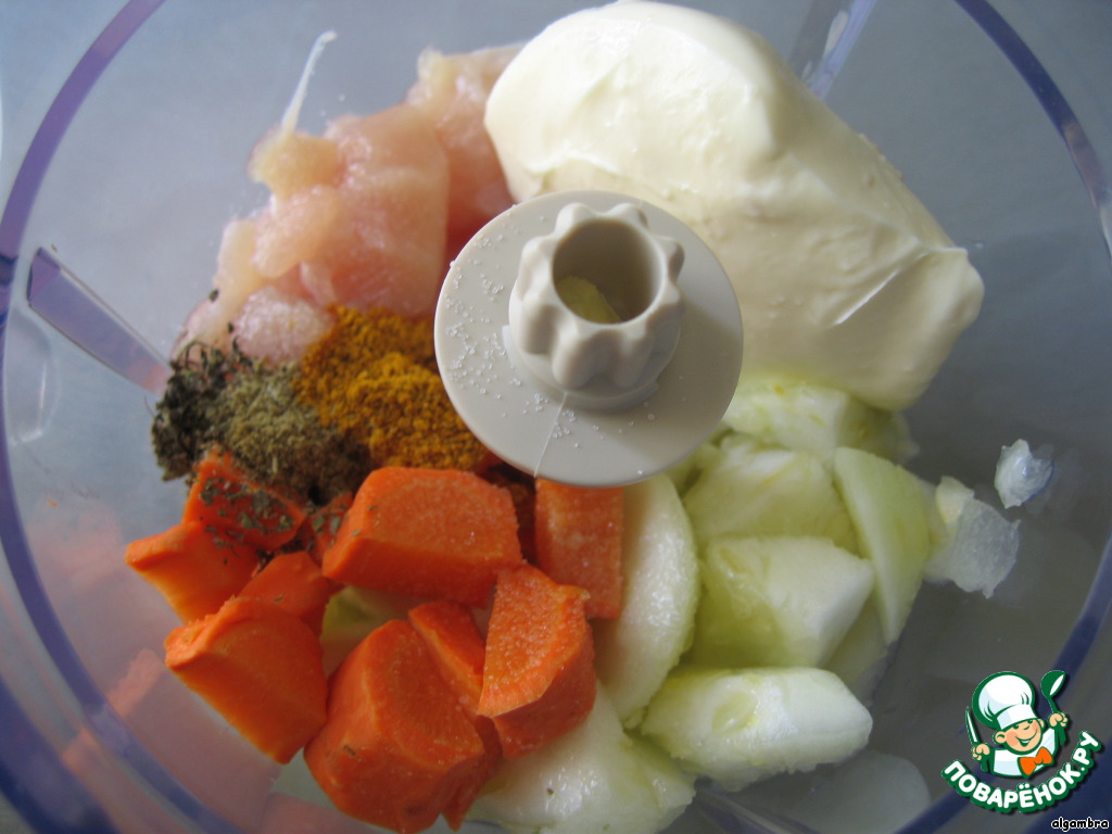 В блендер или комбайн выкладываем куриную грудку, кабачок, морковь, 25-50г плавленого сыра, соль и специи по вкусу. Я положила карри, базилик, хмели-сунели и майоран.