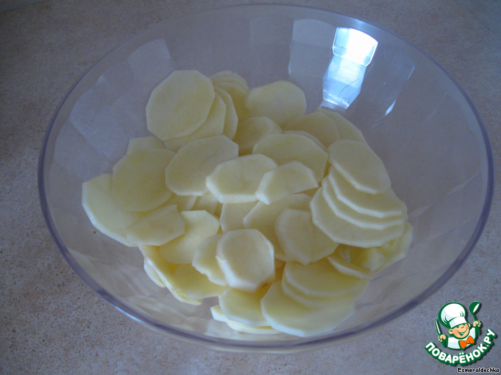 500 г очищеного картофеля (4 средние картофелины) режем кружочками толщиной 2-3 мм. Для этой цели идеально подходит кухонный комбайн, у меня же в ход пошла хлеборезка (она же - "универсальная нарезка").