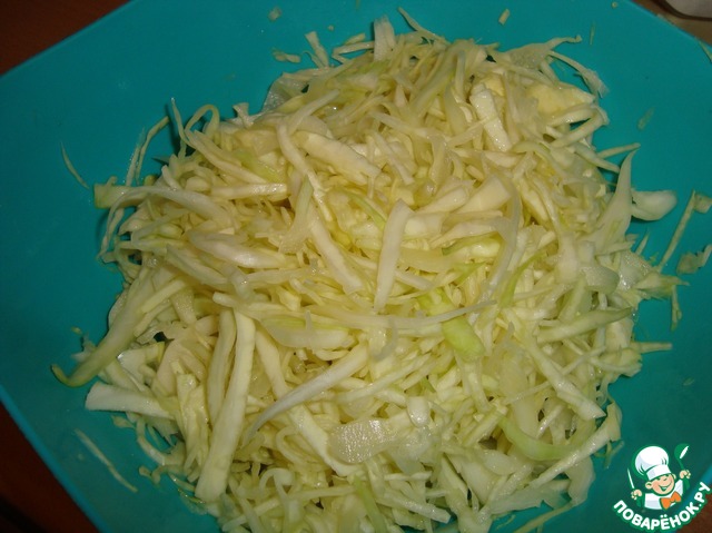 Капусту тонко шинкуем, посыпаем солью и перетираем, чтобы капуста дала сок.