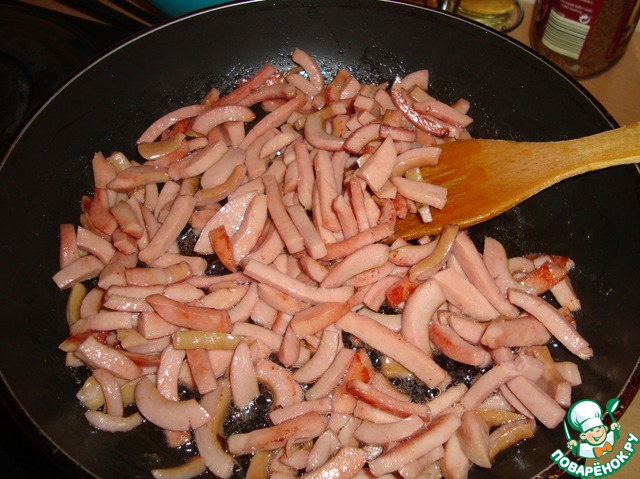 Для начала быстренько приготовим необходимые нам ингредиенты. Колбасу, я брала докторскую, нарезаем соломкой.