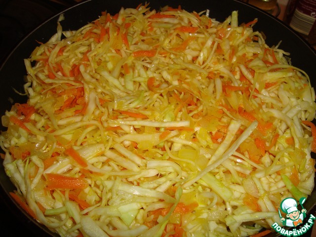 Добавляем капусту, досаливаем по вкусу, перемешиваем, накрываем сковороду крышкой и на среднем огне тушим до полуготовности.