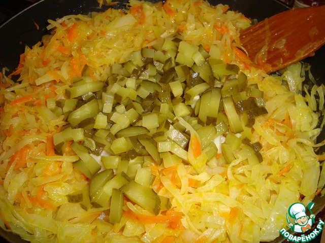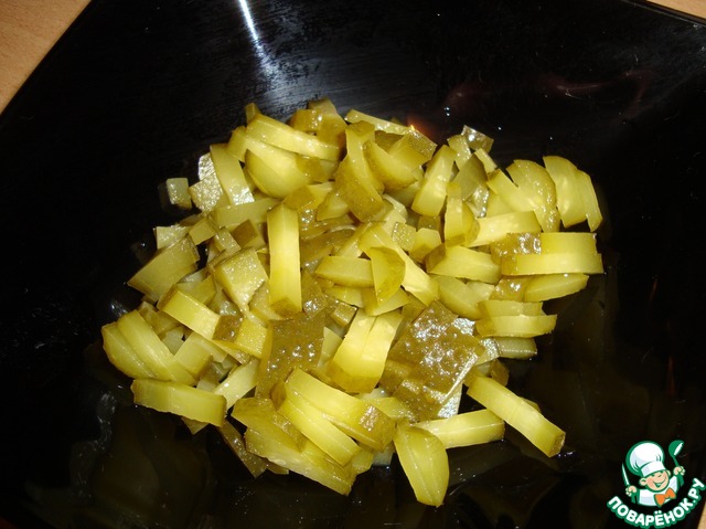 Пока капуста тушится, не тратя время зря, т. к. голодные домочадцы бродят в районе кухни и пытаются чего-нибудь утащить, нарезаем соломкой соленые огурцы.