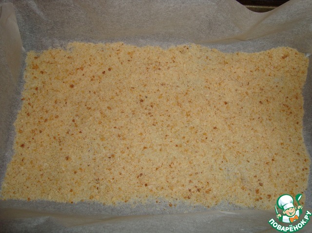 Затем берем форму для запекания. Я застелила ее бумагой для выпечки, т. к. форма уже повидала столько всего (но расстаться с ней не могу какая-то родная она мне стала, думаю многие меня поймут) У кого форма приличная, может этот шаг пропустить и смазать форму маслицем. Дно формы хорошо посыпаем панировочными сухарями.