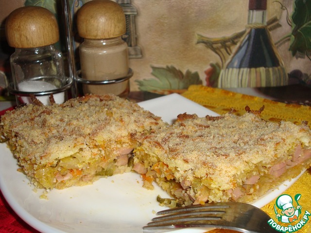 Ну вот практически и все. Берем форму с нашей запеканкой и отправляем ее в заранее разогретую до 180 градусов духовку на 30 минут, до зарумянивания корочки. Ориентируемся по своей духовке. По прошествии времени достаем запеканку из духовки, даем ей минут 5-10 приостыть в форме (если конечно голодающие выдержат эту "пытку") Вот такую красоту мы достаем из духовки.