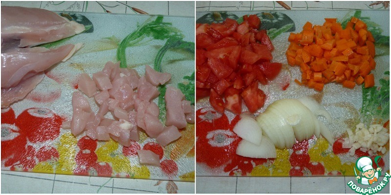 2. Так же кубиками нарезать помидор (по желанию предварительно снять шкурку) и морковь. Лук порезать полукольцами. Чеснок мелко порубить.
