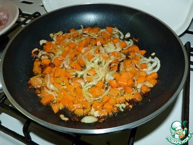 После того как лук начнет слегка зажариваться, выложить в сковороду морковь. Жарить, помешивая, несколько минут.