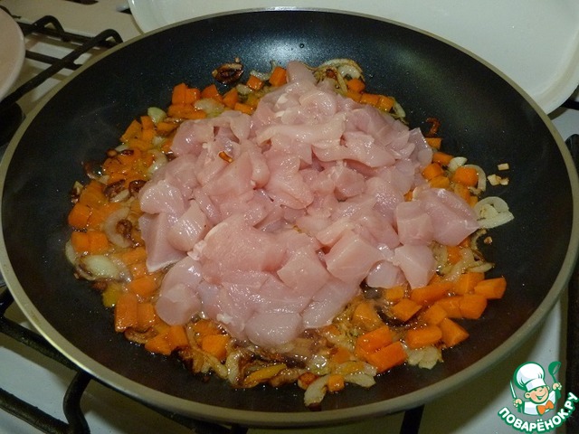 1. Куриную грудку помыть, обсушить на бумажном полотенце, затем нарезать небольшими кубиками.