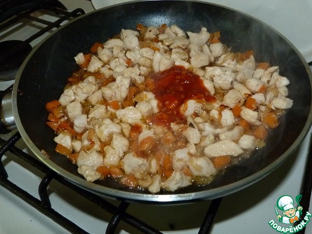 Через пару минут добавить соус "Чили", огонь немного убавить и довести до полуготовности курицы, не забывая помешивать.