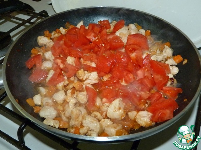 Добавить в сковороду помидоры. Через минуту-две налить по вкусу соевый соус (если не любите, то можно заменить на соль) и жарим еще одну-две минуты.