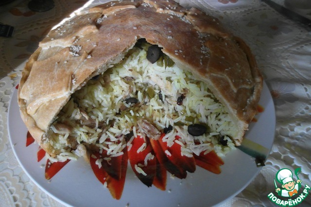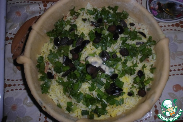 9. Чередуем слои. На последний слой риса выкладываем порезанные зелень и маслины, поливаем растопленным сливочным маслом.