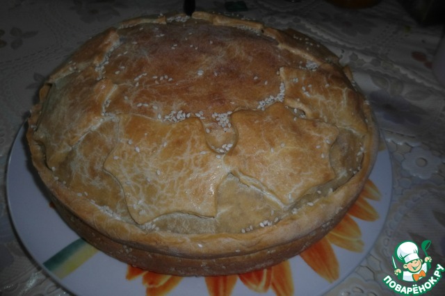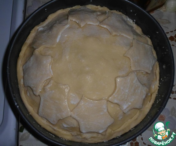 10. Закрываем тестом внахлёст, по верху кладем пласт теста толщиной 3 мм. Украшаем и смазываем сливочным маслом.