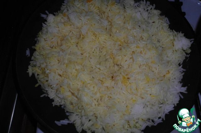 2. Распускаем сливочное масло на сковороде, добавляем рис, сдабриваем куркумой и оставляем.