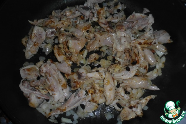 4. Обжариваем нарезанный лук до золотистого цвета. Отделяем от костей курятину, расщепляем руками на кусочки, слегка обжариваем вместе с луком, солим, перчим.