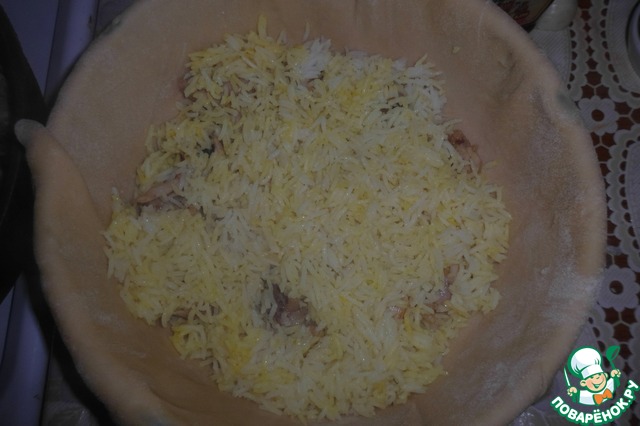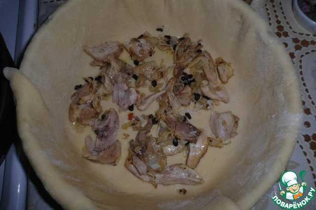 7. Раскатываем тесто толщиной 5 мм. Переносим раскатанное тесто на форму, укладываем его по дну и стенкам посуды, оставляя края свисать. Выкладываем слой мяса, добавляя барбарис.