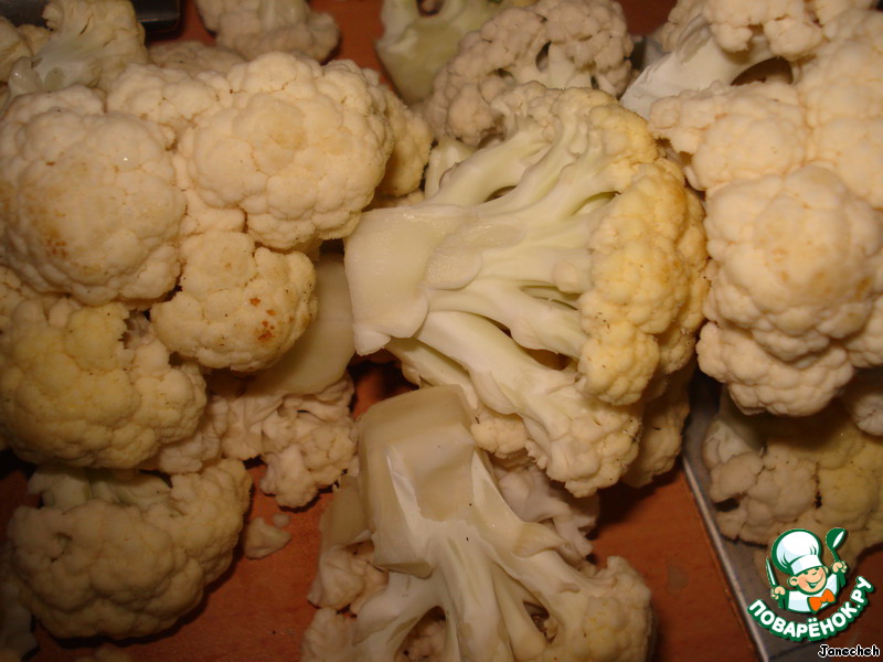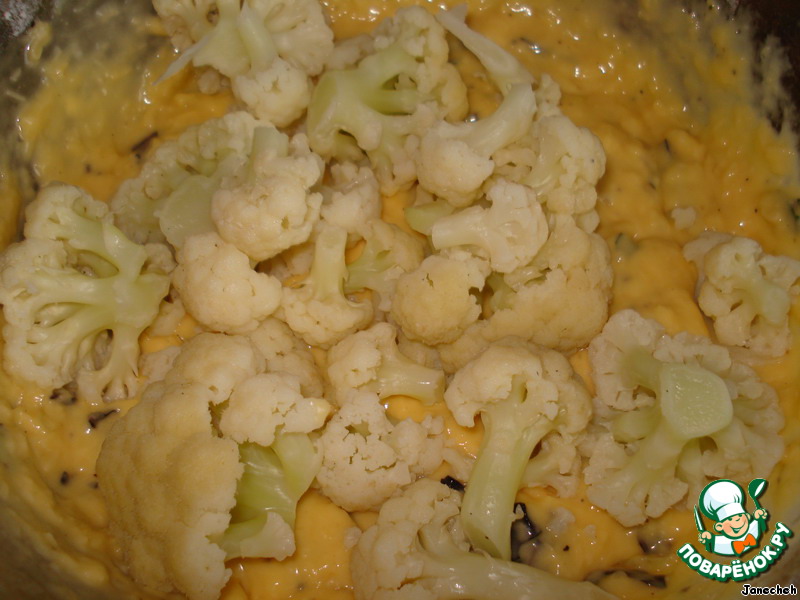 Отделить соцветия цветной капусты от стебля, нарезать не сильно мелко (иначе при варке и запекании соцветия просто расползутся).