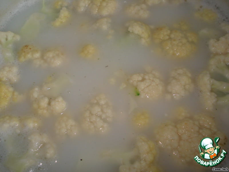 Отварить соцветия в кипящей подсолёной воде (я добавляю немного молока, чтобы капуста сохранила свой цвет) минут 10. Остудить в сотейнике, слив предварительно воду.