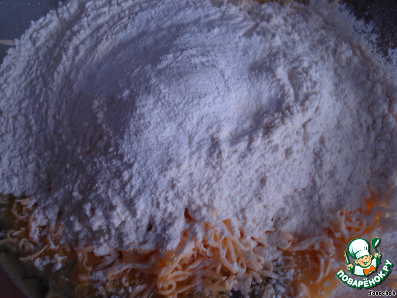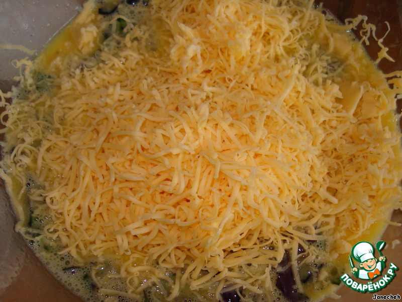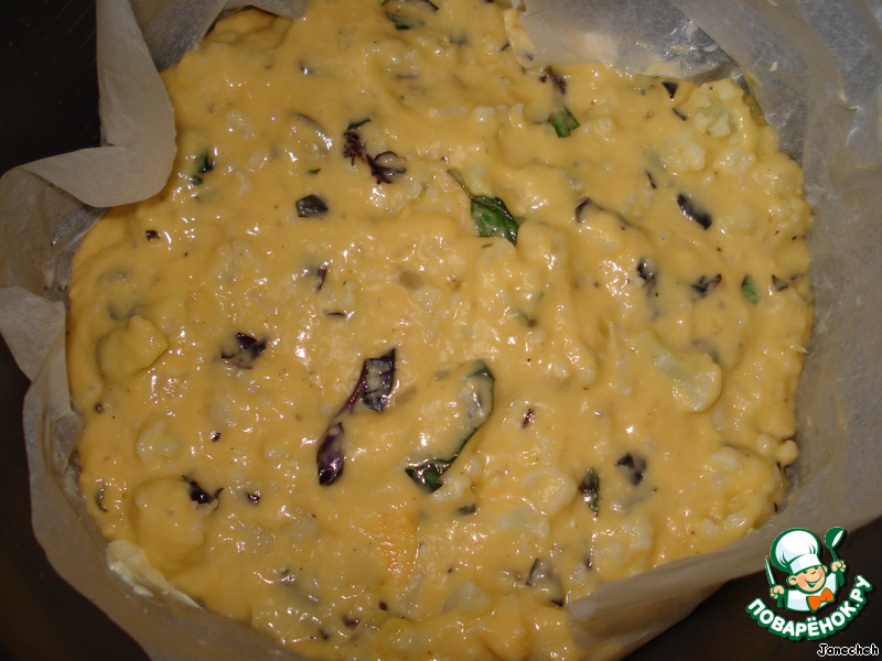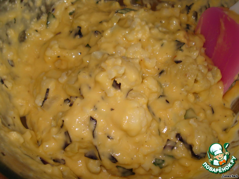 Добавьте туда лук, базилик, натертый сыр, куркуму, черный перец свежемолотый, соль (примерно 1,5 ч.л.).