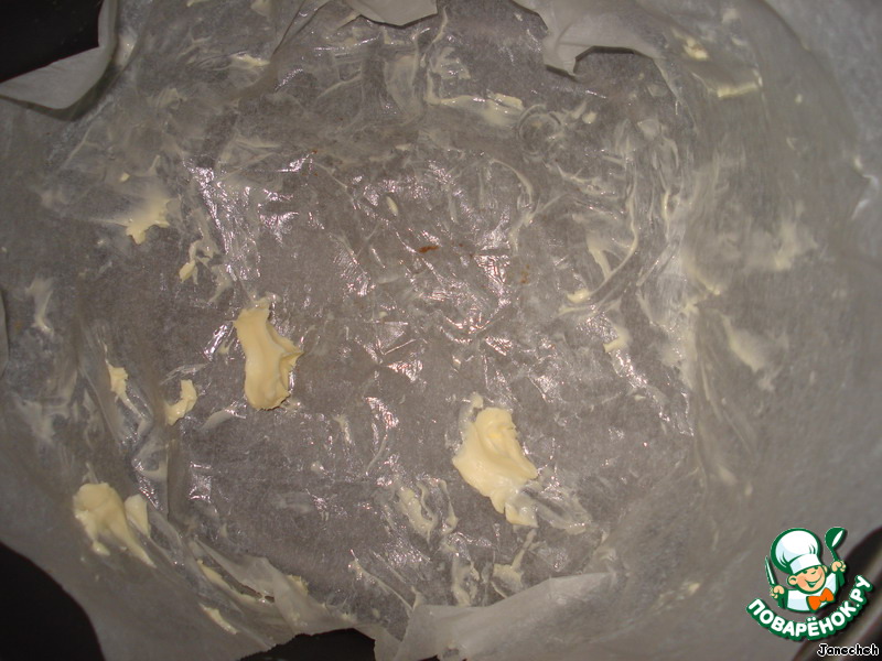 Застелите форму для выпечки пергаментом или бумагой для выпечки. Хорошо промажьте края формы маслом.