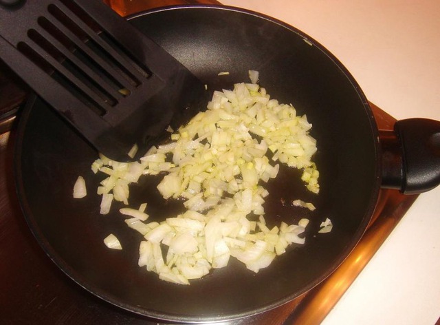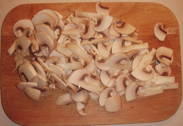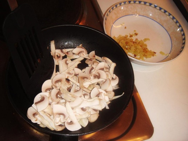 Готовый лучок откладываем в отдельную мисочку, а на эту же сковородку выкладываем обжаривать шампиньоны. Если вы купили сушёные/замороженные грибы, то размочите/разморозьте их до этого согласно инструкции на упаковке.