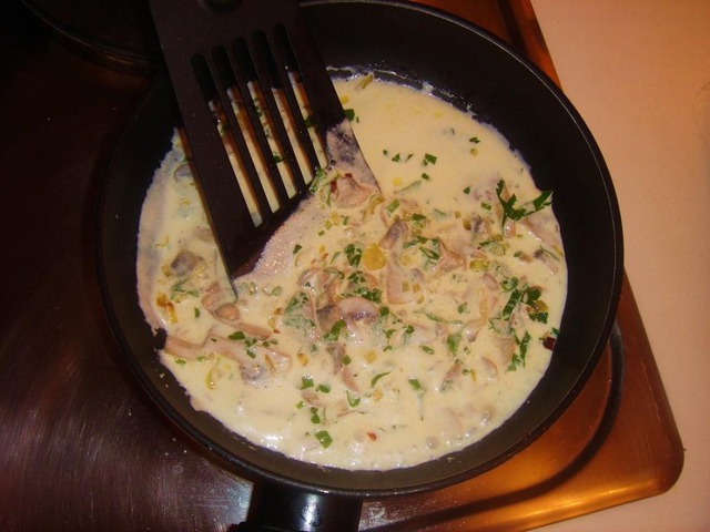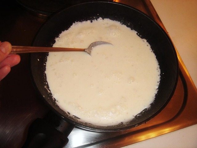 Снова на эту же сковородку выливаем сливки и белое вино.