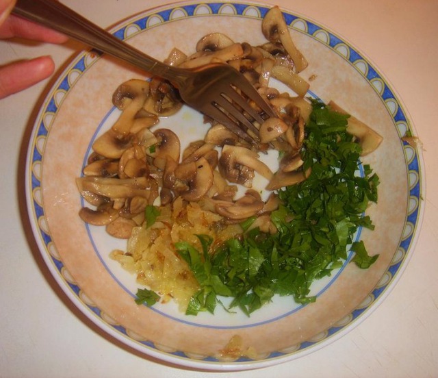 Мелко рубим петрушку и вместе с обжаренными грибами добавляем в мисочку к луку.