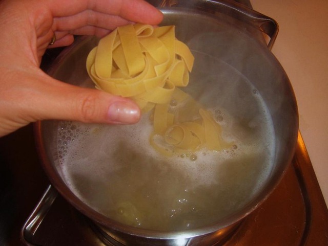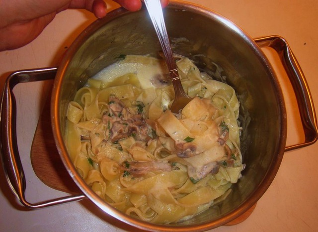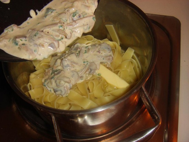 Как только соус закипел, высыпаем в него смесь из лука, грибов и петрушки. Солим, перчим. Сразу же делаем маленький огонь и путь всё это тихо-спокойно тушится, пока мы займёмся макаронами.