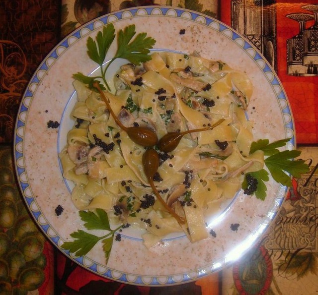 Выкладываем на тарелку. В моём варианте блюдо украшено каперсами и чёрной икрой (не пугайтесь, не осетровой, а всего лишь дешёвой икрой рыбы пинагора. Вкуса она не добавляет никакого, но выглядит эффектно).