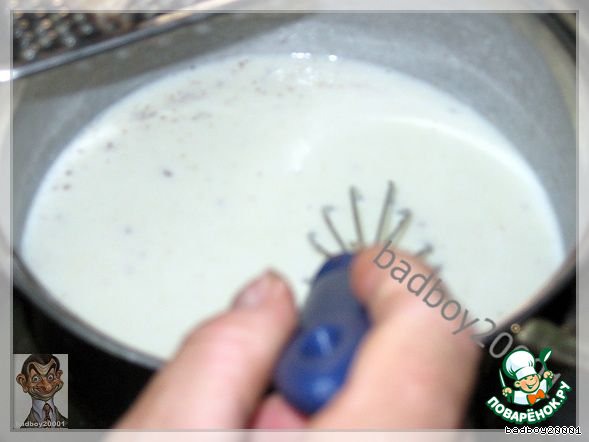 На среднем огне нагреваем пока мука не начнет темнеть, берем молоко и постепенно вливаем в кастрюльку,