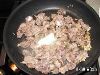 На сковороду к обжаренному имбирю и чесноку добавить сливочное масло и выложить желудки.