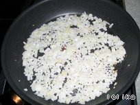 Добавить обжаренный репчатый лук, перемешать и немного обжарить все ингредиенты вместе.