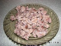 Бульон слить, оставить примерно 1 стакан. Желудки порезать (кому как нравится).