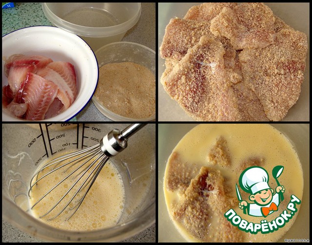 Рыбное филе режем на кусочки, солим, перчим, обваливаем в сухарях и укладываем в форму для микровелле, смазанную маслом.