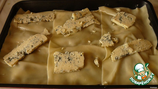 Поверх последнего слоя теста выложить оставшиеся ломтики сыра с плесенью.